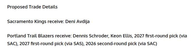 ✅开拓者得到:施罗德、基恩・埃利斯、2027年国王首轮签、2027年马刺首轮签、2026年国王次轮签