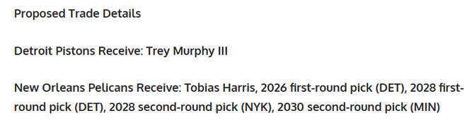 ✅鹈鹕得到:托比亚斯・哈里斯、2026年活塞首轮签、2028年活塞首轮签、2028年尼克斯次轮签、2030年森林狼次轮签