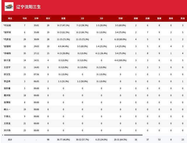 就这场比赛来看,辽宁U19男篮只用了9人登场,代彦龙爆发,15投11中,10罚6中,拿下28分9篮板1助攻,付远旭17投8中,拿到20分8篮板,张轩铭19分9篮板2助攻,孙福恒13投5中,拿到15分9篮板,赵银桥10分8篮板4中。